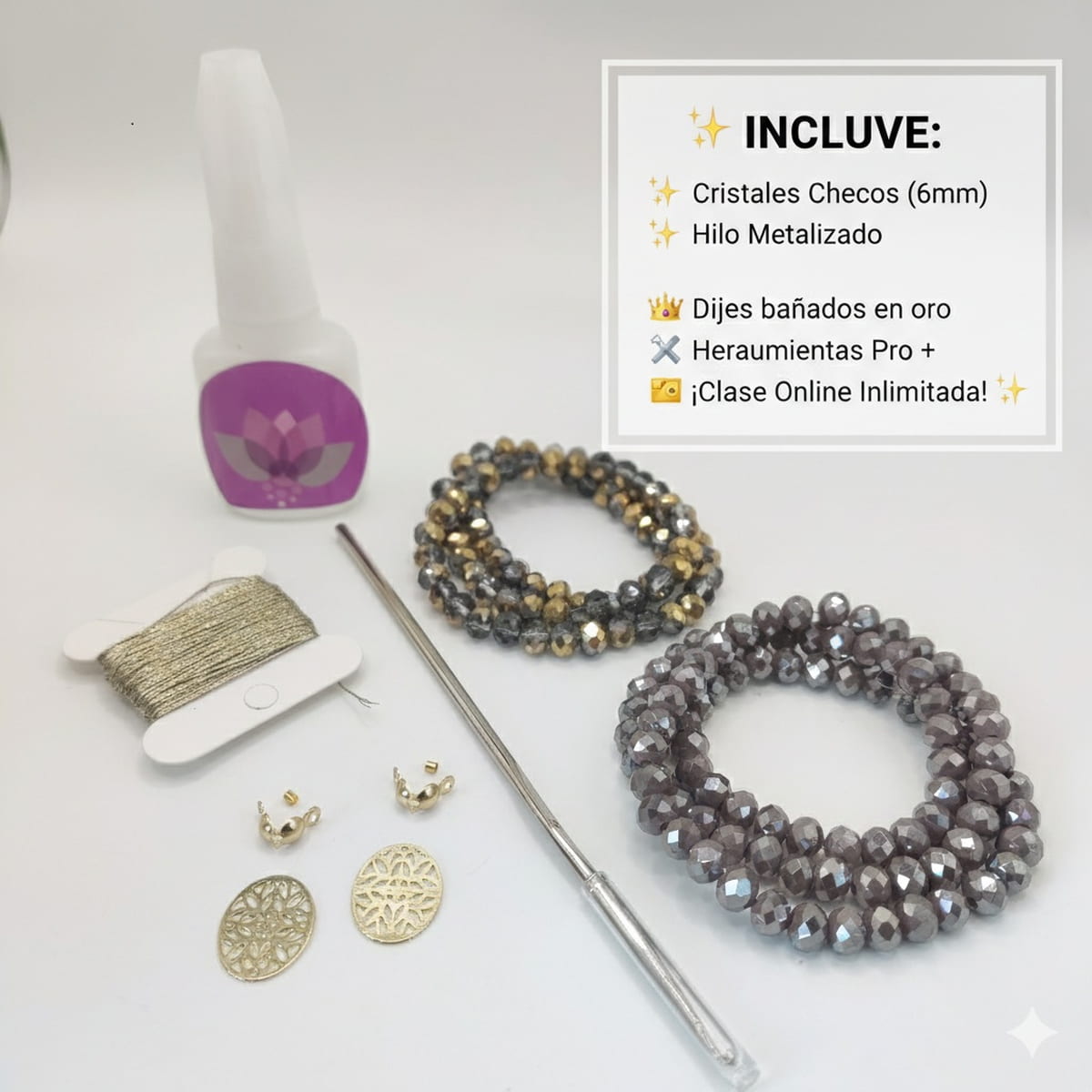 📦 Kit completo: Incluye cristales, dijes bañados en oro y herramientas.